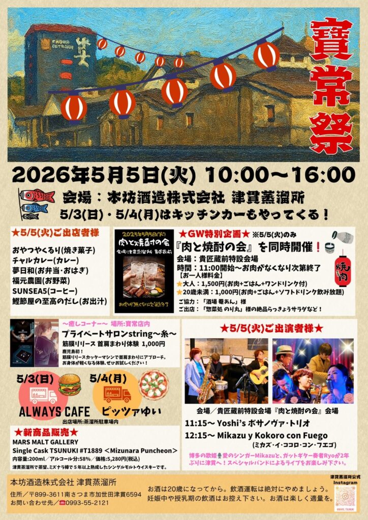 お野菜販売予定 5月5日 (寶常祭) 2026年04月25日2026年04月25日 福元農園 5月5日に本坊酒造 津貫工場にて開催される「寶常祭」にてお野菜の販売を行います! お肉と焼酎の会の同時開催のほか、 焼き菓子・カレー・お弁当・コーヒーなどの出店もあります! ありのままお野菜では、 たまねぎ・だいこん・にんにくの芽など 販売する予定です!! ぜひ足をお運びください! 場所は、マルス津貫蒸溜所 津貫貴匠蔵 本坊酒造 〒899-3611 鹿児島県南さつま市加世田津貫6594